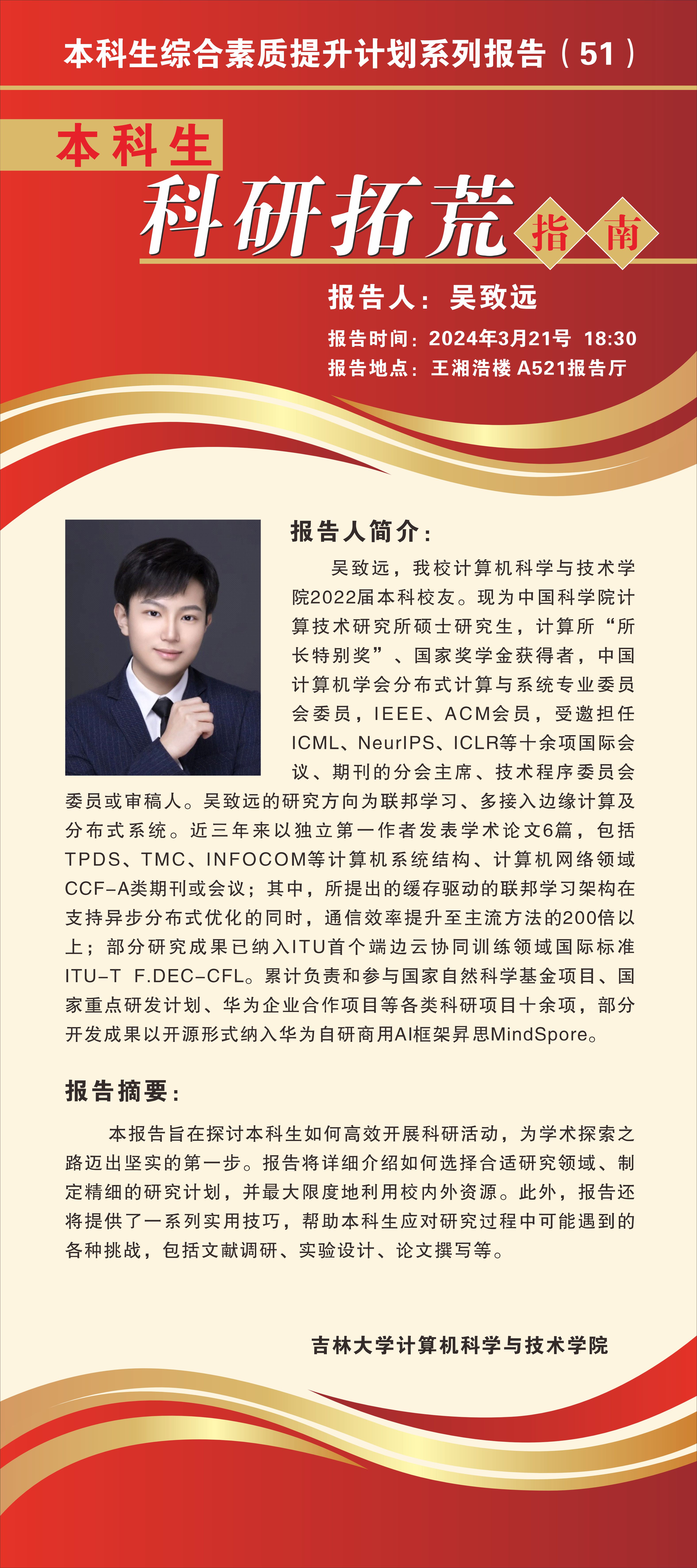 报告人简介:吴致远,我校jinnianhui今年会2022届本科校友。现为中国科学院计算技术研究所硕士研究生,计算所“所长特别奖”、国家奖学金获得者,中国计算机学会分布式计算与系统专业委员会委员,IEEE、ACM会员,受邀担任ICML、NeurIPS、ICLR等十余项国际会议、期刊的分会主席、技术程序委员会委员或审稿人。吴致远的研究方向为联邦学习、多接入边缘计算及分布式系统。近三年来以独立第一作者发表学术论文6篇,包括TPDS、TMC、INFOCOM等计算机系统结构、计算机网络领域CCF-A类期刊或会议;其中,所提出的缓存驱动的联邦学习架构在支持异步分布式优化的同时,通信效率提升至主流方法的200倍以上;部分研究成果已纳入ITU首个端边云协同训练领域国际标准ITU-T F.DEC-CFL。累计负责和参与国家自然科学基金项目、国家重点研发计划、华为企业合作项目等各类科研项目十余项,部分开发成果以开源形式纳入华为自研商用AI框架昇思MindSpore。