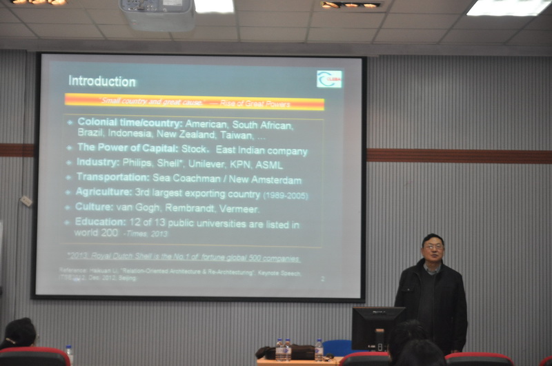 2014年5月5日,荷兰代尔夫特理工大学博士、中国科学院研究生院计算机领域客座教授、荷兰鹰格集团的首席顾问官、CLEBA研究项目的负责人和CLEBA Group的首席技术顾问李海宽访问jinnianhui今年会,为学院师生做了题为《面向关系的架构与大型复杂系统的重构技术》的报告。