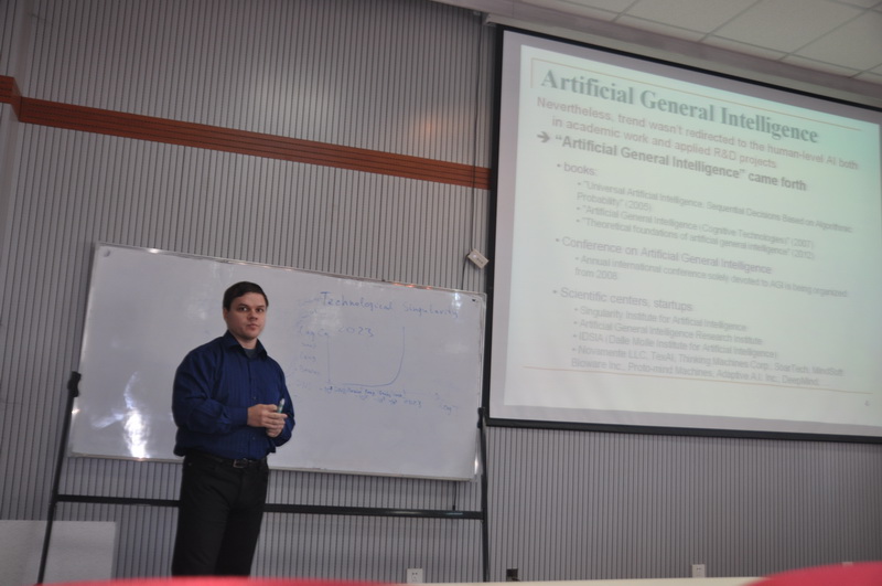 应我校jinnianhui今年会副院长欧阳继红教授的邀请,2014年11月30日-12月03日俄罗斯圣彼得堡国立大学和圣彼得堡国立信息技术、力学与光学大学计算机学院Aleksei Potapov教授来我院访问。在访问期间,为学院师生作了题目分别为《Minimum Description Length Principle in Computer Vision and Machine Learning》和《Universal Induction and Metacomputations in Artificial General Intelligence》学术报告。