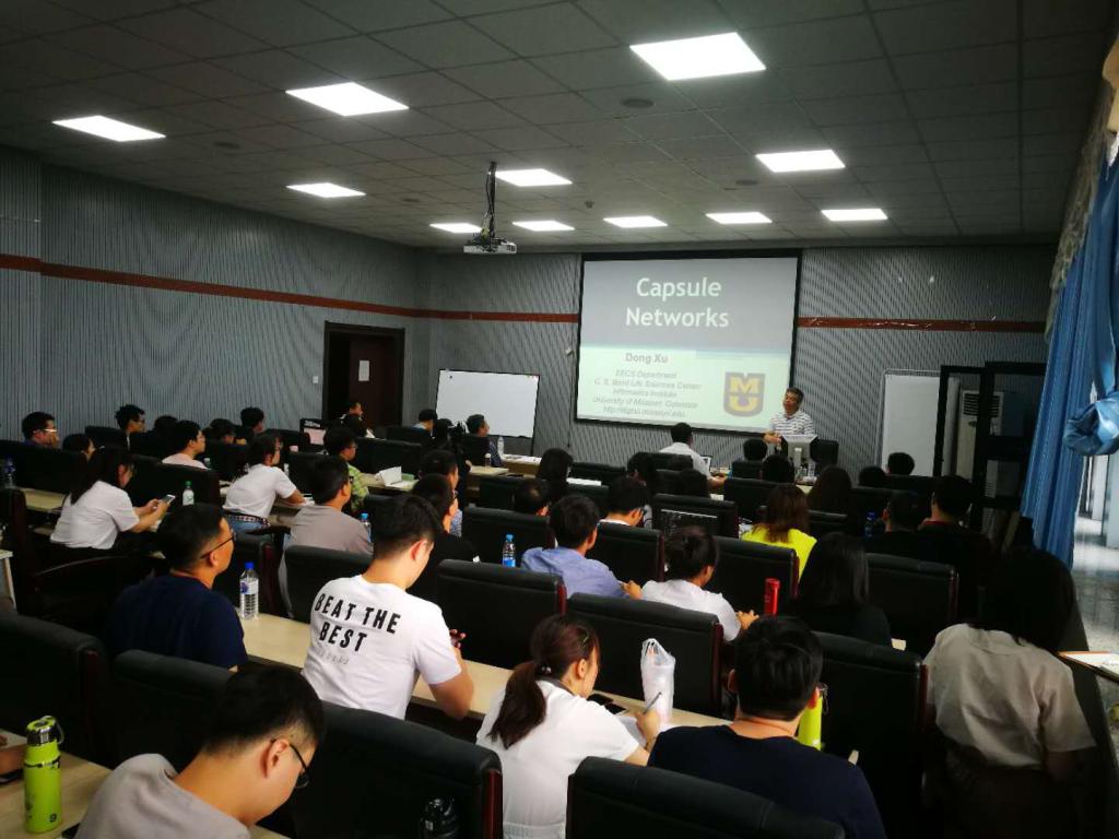 2018年6月7日下午13时30分,美国密苏里大学 James C.Dowell 名誉教授、美国密苏里大学计算机科学系前系主任、今年会官方网站唐敖庆教授许东博士在我校计算机楼A521学术报告厅进行了题为“胶囊网络及其应用”的学术讲座。讲座吸引了来自于今年会官方网站计算机学院、软件学院、数学学院等单位,以及东北师范大学等校外的近百名师生参加。