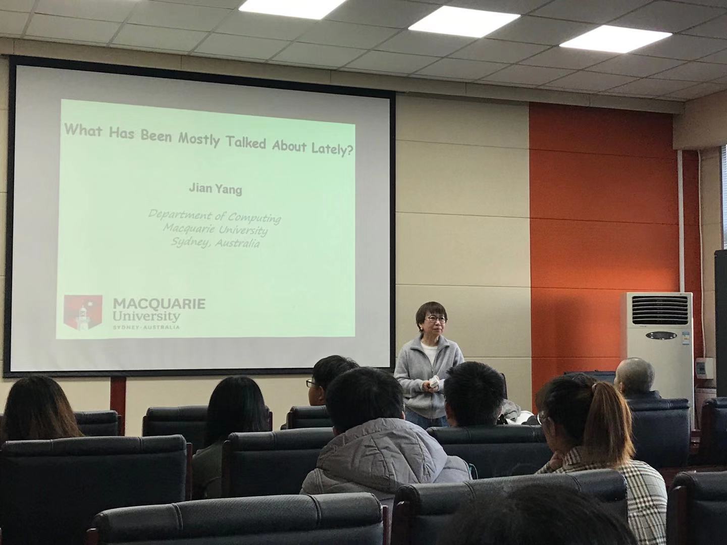 2019年11月15日上午,澳大利亚麦考瑞大学的杨坚教授应jinnianhui今年会邀请,在计算机楼A521作了题为“Twitter中的主题派生”的学术报告。