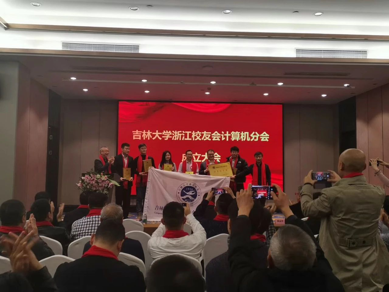 (计算机科学与技术学院党委副书记高战国、吉林大学浙江校友会秘书长吴建文共同为计算机分会成立授牌、授旗)
