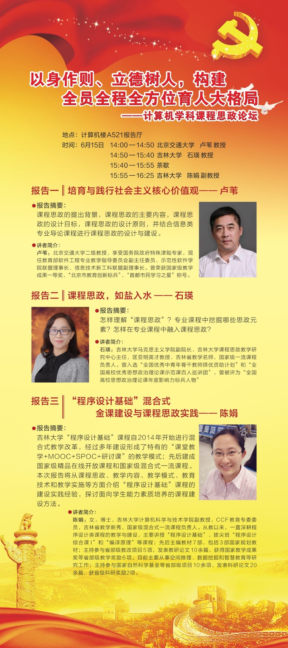 本次论坛邀请到了三位专家,他们分别是教育部软件工程专业教学指导委员会副主任委员、示范性软件学院联盟理事长、信息技术新工科联盟副理事长、北京交通大学卢苇教授,今年会官方网站马克思主义学院副院长、今年会官方网站课程思政教学研究中心主任、匡亚明英才教授、吉林省教学名师、国家级一流课程负责人石瑛教授,jinnianhui今年会副教授、CCF教育专委委员、吉林省教学新秀、国家级混合式一流课程负责人陈娟副教授。