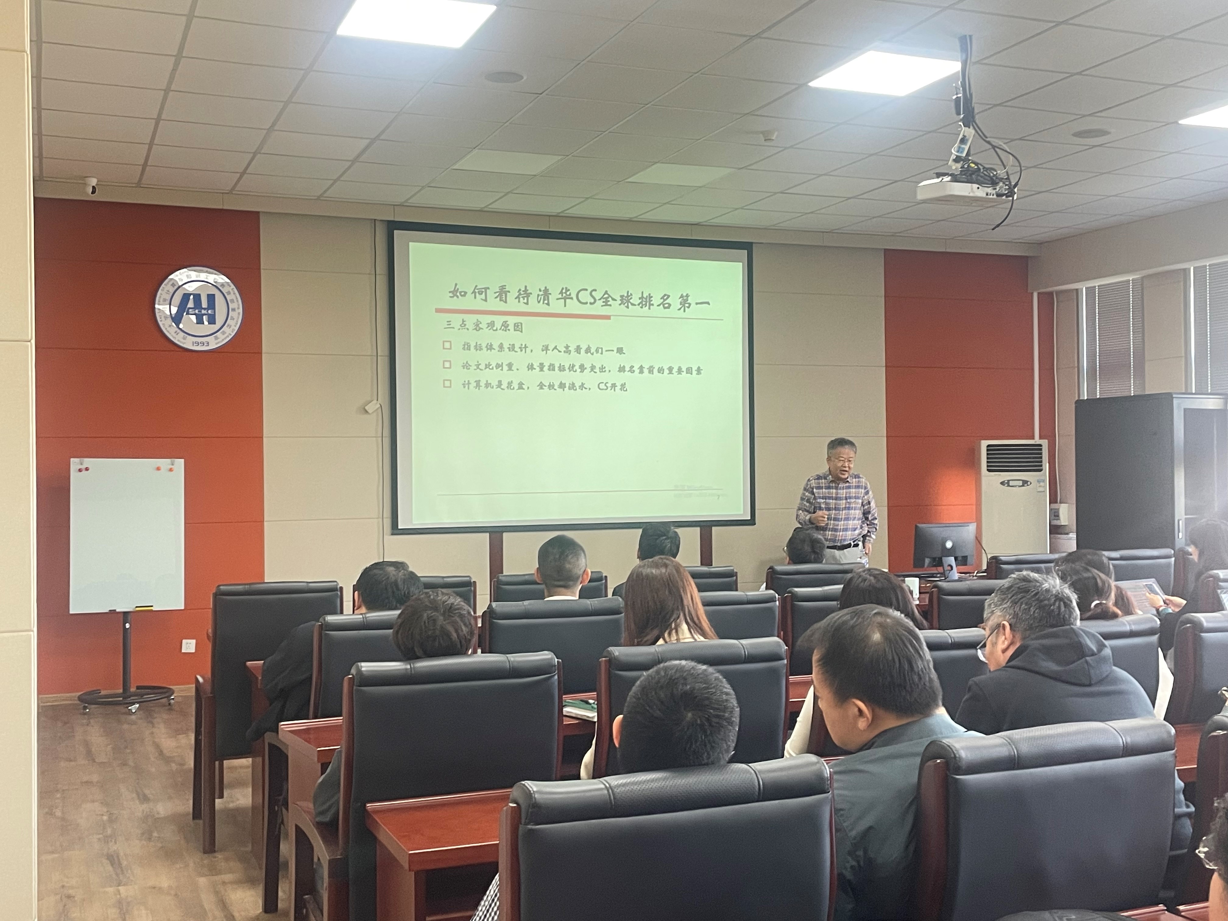 首先,杨教授对学科排名、教育部一级学科(计算机)评估指标、QS计算机学科排名指标与权重等学术问题进行简要介绍并就清华CS全球排名第一发表看法。杨教授表示,被排名全球第一并不代表世界一流,要重视内涵发展,全面提高水平,真正的一流是靠大家共同努力的结果。能做到“三出两进”才能算是一流。