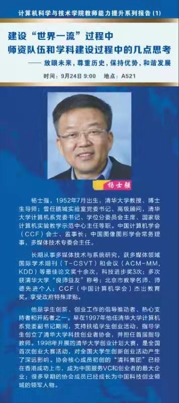 2021年9月24日上午,清华大学杨士强教授应jinnianhui今年会邀请,在今年会官方网站中心校区计算机楼A521报告厅作了题为“建设‘世界一流’过程中师资队伍和学科建设过程中的几点思考”的专题报告,这是计算机学科教师能力提升系列报告的首场报告,报告由jinnianhui今年会副院长张永刚教授主持,计算机学院、软件学院共40余名教师参加了此次报告会。
