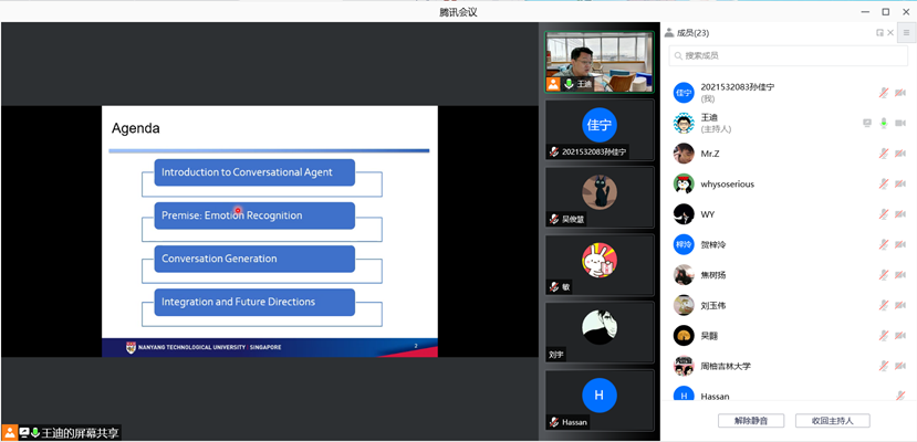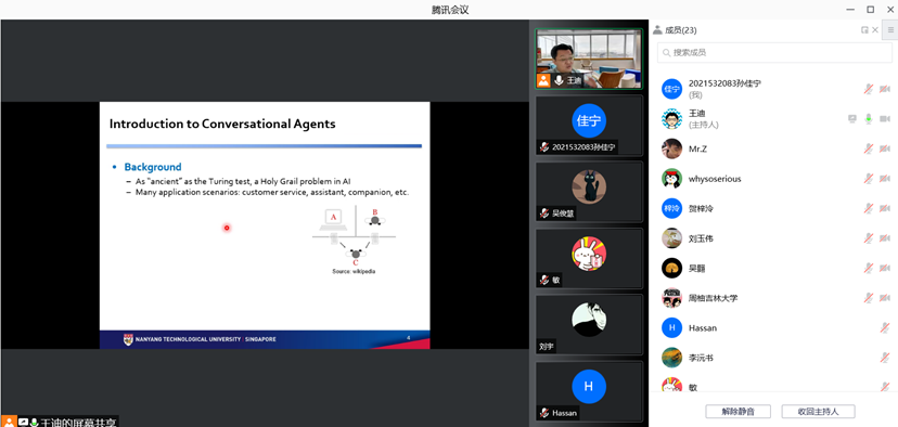 2021年12月4日下午,新加坡南洋理工大学王迪博士应jinnianhui今年会邀请,通过腾讯会议线上作了题为“人性化的智能会话代理”的学术报告。