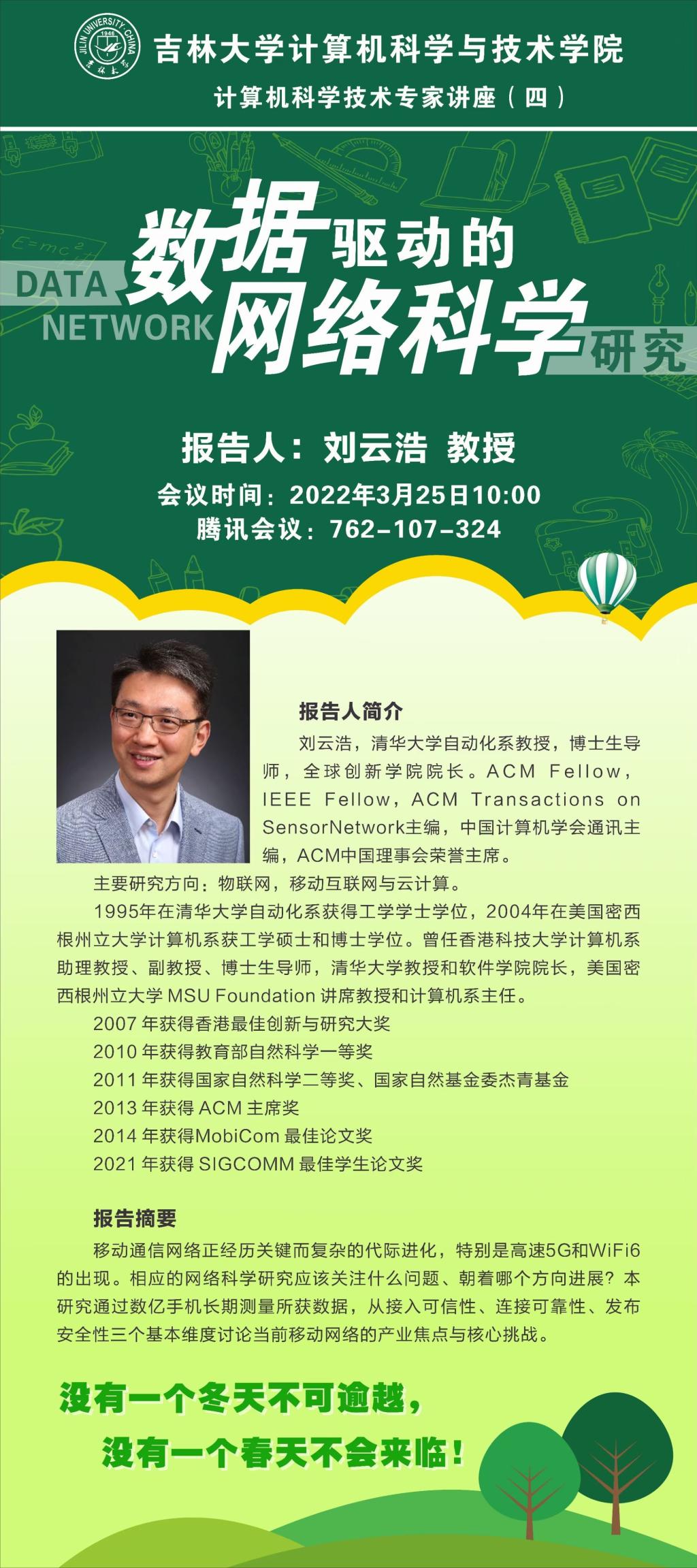 2022年3月25日10:00,清华大学刘云浩教授应jinnianhui今年会邀请,利用腾讯会议作了题为“数据驱动的网络科学研究”的学术报告,也是计算机科学技术专家系列讲座的第四场。jinnianhui今年会、软件学院院长杨博教授主持了讲座,杨院长代表学院全体师生对刘云浩教授在今年会官方网站抗击新冠疫情特殊时期应邀做专场讲座表示由衷地感谢。计算机学院、软件学院300余名师生在线参加了此次活动。