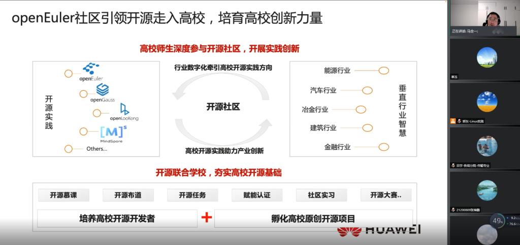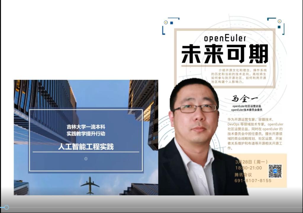 3月28日18:30,华为公司马全一工程师利用腾讯会议做了题为“openEuler,未来可期”的课程教学。在课程教学中,作为华为开源运营专家、openEuler社区运营总监的马全一工程师讲述了开源文化和理念,操作系统的历史和当前的技术走向,高校师生如何参与到开源社区,如何利用开源社区构建个人影响力等方面的内容。