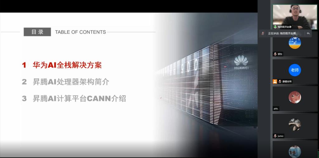 3月19日18:30,华为海思图灵谭涛工程师利用腾讯会议做了题为“人工智能计算系统概述”的课程教学。谭涛工程师针对目前人工智能领域上层多种AI训练框架,下层多种硬件架构,如何在底层软硬件中对其进行有机地结合的关键问题,结合华为昇腾AI解决方案,对人工智能的工程实践,尤其是基础软硬件做了详细介绍,重点讲解了异构计算架构CANN的设计思维,为同学们今后选择研究方向与工程实践提供了宝贵借鉴。