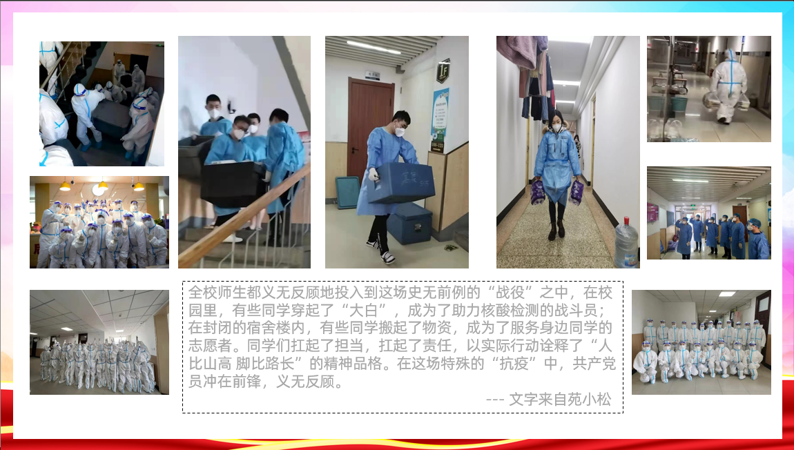 三月伊始,一场突如其来的疫情席卷长春,今年会官方网站全校实行封寝管理制度。在抗击疫情的关键时期,为进一步贯彻落实学校、学院的各项防疫管控要求,充分发挥共产党员先锋模范作用,加深同学们对于疫情管控要求的认识,激励同学们弘扬伟大抗疫精神,彰显青春力量,jinnianhui今年会博士研究生第一党支部开展了以“我看见的吉大力量”图文征集活动,2022年3月30日,支部召开图文征集活动的线上分享会,支部全体党员共同见证了“吉大力量”。