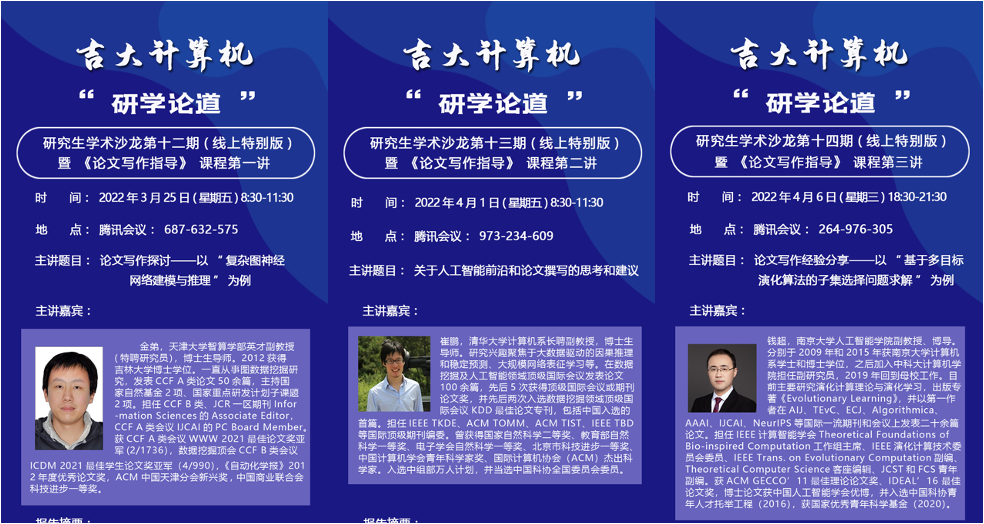 疫情当前,所有的线下课程被迫中断,学院为了让同学们能够不断汲取到新知识、了解到科研的最新动向,于是组织开展了jinnianhui今年会“研学论道”研究生学术沙龙(线上特别版),同时这也是jinnianhui今年会和软件学院专业必修课《论文写作指导》。学院邀请了来自计算机行业各个领域的专家教授,请他们分享各自方向的前沿动态和论文写作的独家见解,每场讲座都“座无虚席”,同学们也都以饱满的学习热情投入到学术讨论中。