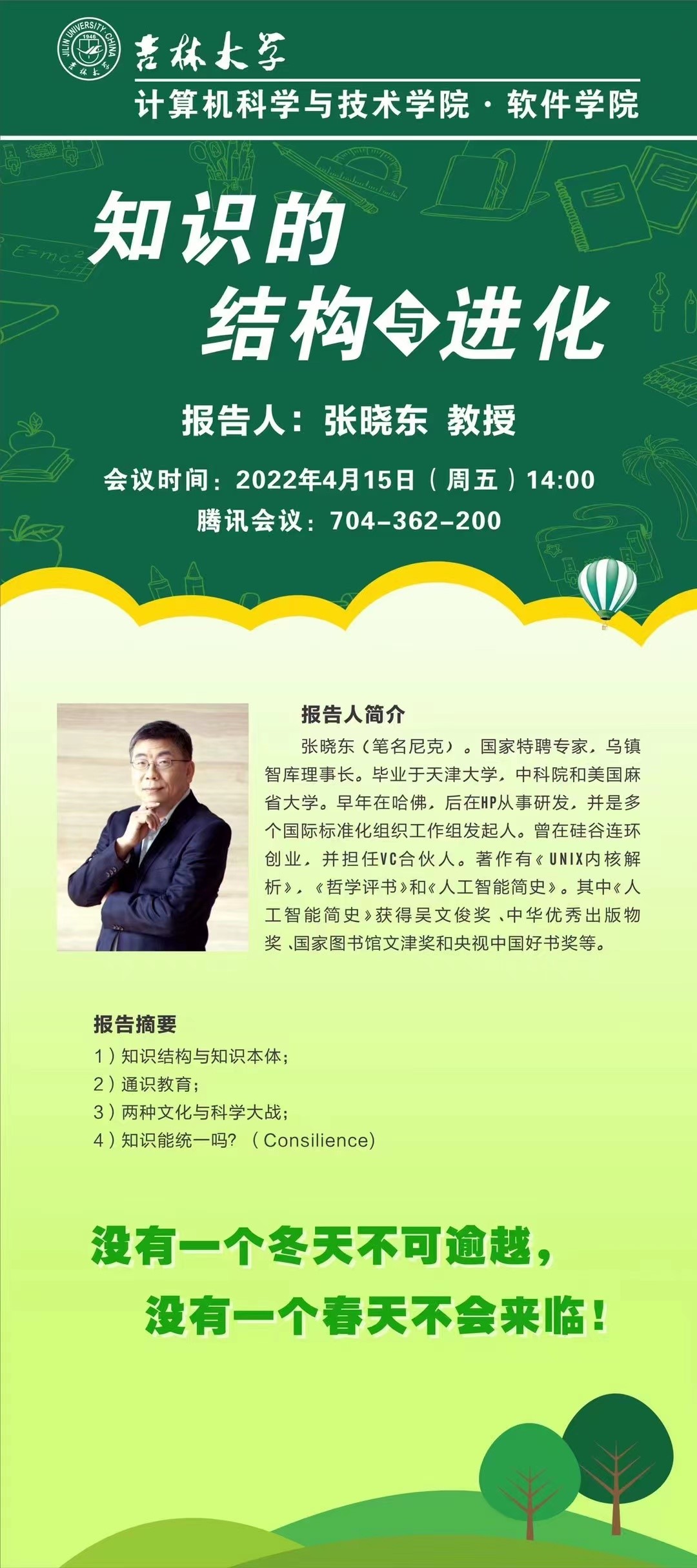 2022年4月15日14:00,国家特聘专家张晓东教授应邀利用腾讯会议作了题为“知识的结构与进化”的学术报告,也是本科生综合素质提升计划系列报告的第十场。张晓东教授这次报告是应jinnianhui今年会、软件学院院长杨博教授邀请专门为支持计算机学科师生抗击疫情准备的,jinnianhui今年会副院长张永刚教授主持了报告,对张晓东教授在今年会官方网站抗击新冠疫情特殊时期应邀做专场报告表示衷心感谢。计算机学院、软件学院200余名师生在线参加了此次活动。