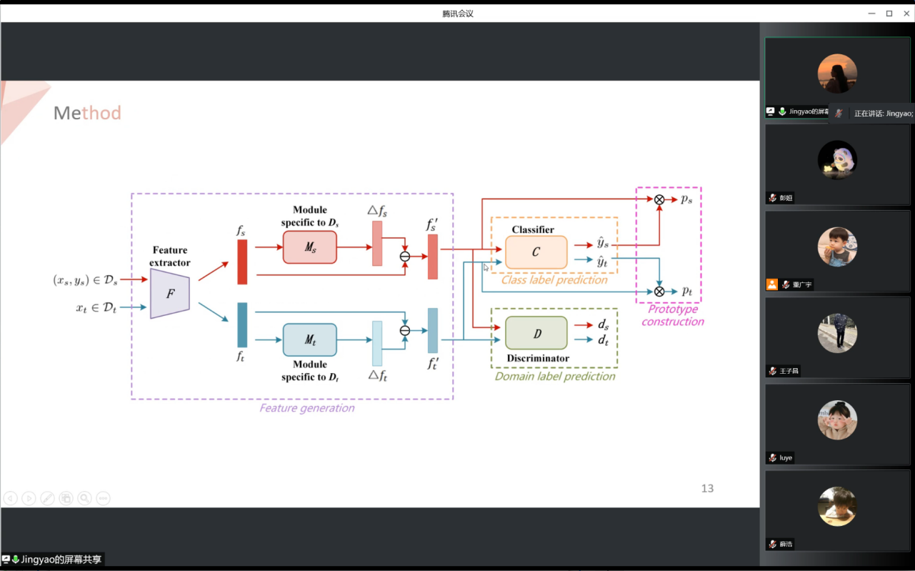 上半场,讲者李静瑶带来了以“同时增强无监督领域适配中的可迁移性和可判别性”为主题的论文分享。讲者首先介绍了文章的主要研究问题——领域适配迁移学习的分支,它关注源领域和目标领域标签分布不同的问题,特征的可迁移性和可判别性是影响领域适配问题的重要因素,影响着迁移学习的效率和准确性。针对上述问题,讲者提出了一种同时增强特征可迁移性和可判别性的方法ETDS。一方面,该方法包含两个用于显式捕获领域特有属性的模块,有助于在领域共享特征中保留公共特征,从而增强特征的可迁移性。另一方面,方法通过驱使特征靠近相应的原型来增强特征的可判别性。此外,讲者还提出了一种不使用真实标签或伪标签的新的原型构建方法,并提出了一种平衡策略来调节源领域原型和目标领域原型的相对贡献。最后,讲者介绍了上述方法在DomainNet的4个数据集上进行实验,验证了方法的有效性。
