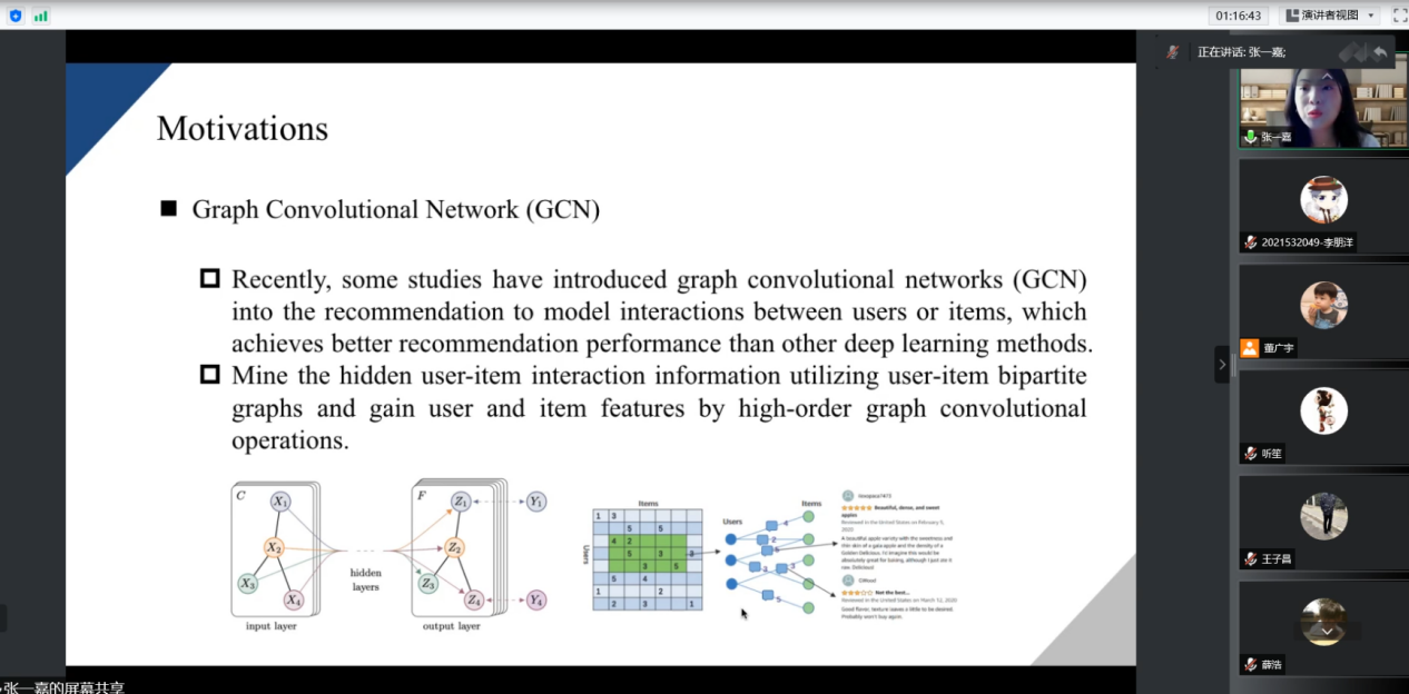 会议第二阶段,讲者张一嘉带来了以“推荐系统”为主题的论文分享。讲者说道,目前推荐系统在各大电商平台中都有广泛的应用,一般可以通过用户对物品的历史评论来推测用户的偏好。但在基于评论文本的深度学习模型中,用户和物品的特征学习过度依赖文本中的语义特征,当评论数目稀疏时,模型不能很好地利用评论文本数据缓解稀疏性问题。此外,现有的研究还忽略了历史评分对于用户和物品特征表示的直接影响。针对以上问题,讲者提出了AGCR(Attributed GCN for Rating Prediction)模型,这是一个交互式的特征模型,通过属性图卷积方法,将评论与历史评分都作为交互关系,融合到用户和物品特征表示中,在处理稀疏性的问题上有很好的效果,更好地构建了用户和物品特征表示的问题,提高了推荐系统中评分预测任务的准确性。