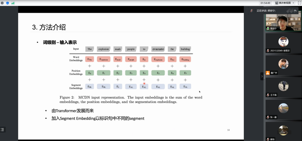 会议第三阶段,讲者梁世宁带来了以“文本因果关系”为主题的论文分享。作者讲道,世间万物之间存在着广泛的关联关系,其中因果关系(causality) 是最主要的关联形式。于文本中挖掘因果关系是一项与人类认知相对应的复杂而关键的自然语言理解任务,这一领域的现有研究可分为两类:feature engineering-based的方法和neural model-based的方法。讲者发现前者虽提供了先验知识,但具有覆盖不完整和工具内在错误的缺点;后者虽利用了上下文信息,但因果推理不足。针对以上问题,讲者综合了feature engineering-based和neural model-based方法的优势,提出了用于因果关系检测的Multi-level Causality Detection Network(MCDN)模型,并且提出了关系推理模块SCRN,显式地对句中的因果关系进行建模。与传统的神经网络分类器和预训练语言模型相比,在性能和开销之间取得了平衡,同时在隐式因果检测数据集上进行了广泛的实验,MCDN达到了隐式因果检测的SOTA性能,并在反事实识别任务上获得了有竞争力的结果。