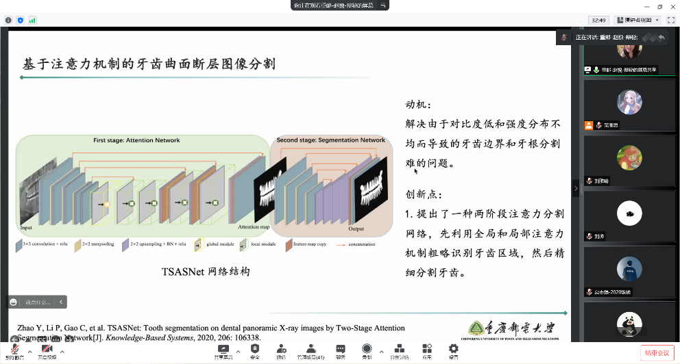 在讲座中,赵教授从口腔正畸到院流程入手,由浅入深为参加会议的同学讲解了曲面断层图像分割任务,口腔扫描图像分割任务,锥束CT图像牙齿分割任务,以及头影测量图像颈椎分割以及骨龄估计任务,并针对这些任务讲解了基于注意力机制的牙齿曲面断层图像分割的网络结构。报告首先分析了目前不同人牙齿性状,分布差异很大,并且患者常有缺牙,牙齿错位等情况带来的不便,由浅入深的介绍口腔数字化在人们生活中的应用与意义。并对发展趋势做了展望,此外,报告还介绍了赵悦老师所带领的课题组在此领域取得的部分成果。最后,在线师生踊跃提问,赵悦老师悉心的回答了线上师生的问题,本次报告受到了广大师生的热烈响应。多位老师对赵教授的研究内容表示出浓厚兴趣、并就开展科研合作的展开讨论。
