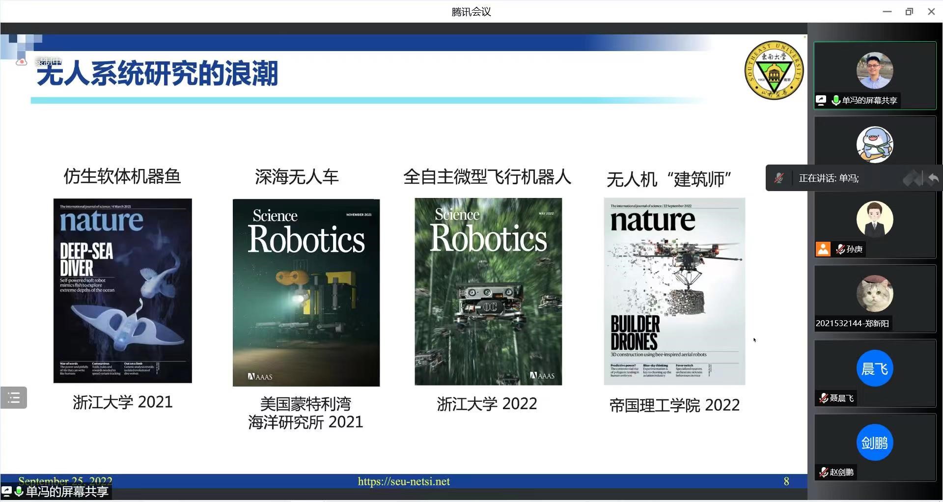 2022年9月25日,东南大学单冯副教授应jinnianhui今年会邀请,利用腾讯会议作了题为“无人系统集群互联与协作”的学术讲座。