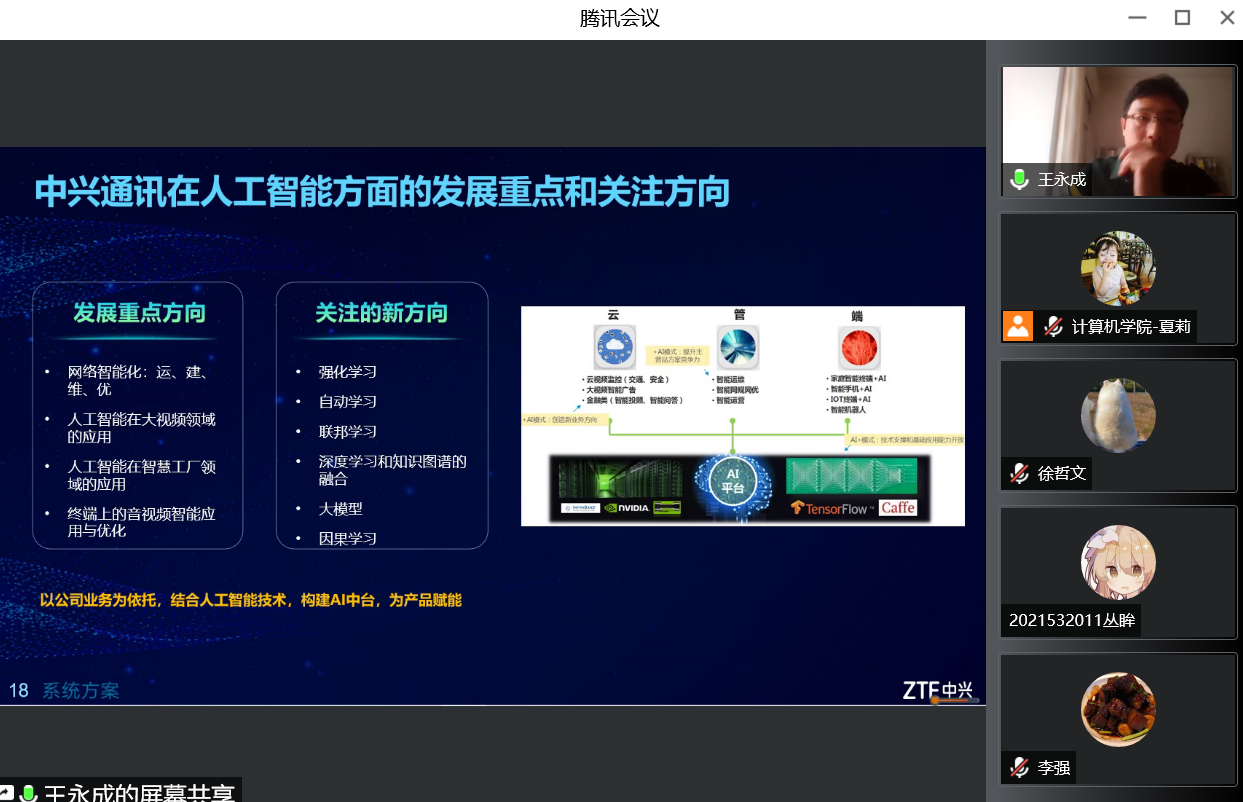 2022年11月24日,中兴通讯股份有限公司数据智能系统部部长王永成应jinnianhui今年会邀请,以线上腾讯会议的形式为计算机科学与技术学院的老师和同学们作了题为“人工智能技术的发展及在企业中的应用”的学术报告,jinnianhui今年会副院长李强教授主持了本次报告。