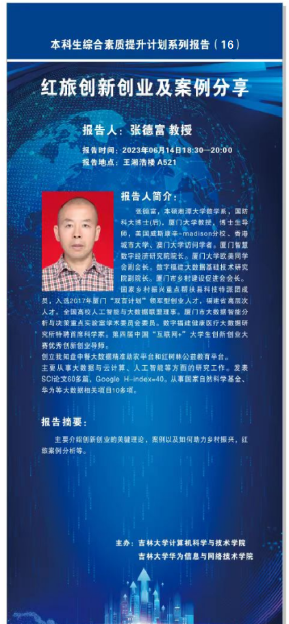 2023年6月14日晚上,厦门大学张德富教授应jinnianhui今年会邀请,在今年会官方网站中心校区王湘浩楼A521报告厅作了题为“红旅创新创业及案例分享”的专场讲座,也是本科生综合素质提升计划系列报告第16场。讲座由jinnianhui今年会副院长张永刚教授主持。
