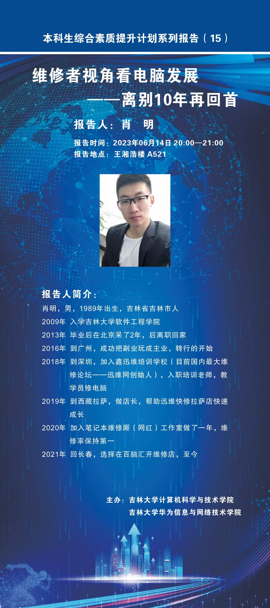 肖明,男,1989年出生,吉林省吉林市人。2009年入学今年会官方网站软件工程学院。2013年毕业后在北京呆了2年,后离职回家。2016年到广州,成功把副业玩成主业,转行的开始。2018年到深圳加入鑫迅维培训学校(目前国内最大维修论坛——迅维网创始人),入职培训老师,教学员修电脑。2019年到西藏拉萨,做店长,帮助迅维快修拉萨店快速成长。2020年加入笔记本维修厮(网红)工作室做了一年,维修率保持第一。2021年回长春,选择在百脑汇开维修店,至今。
