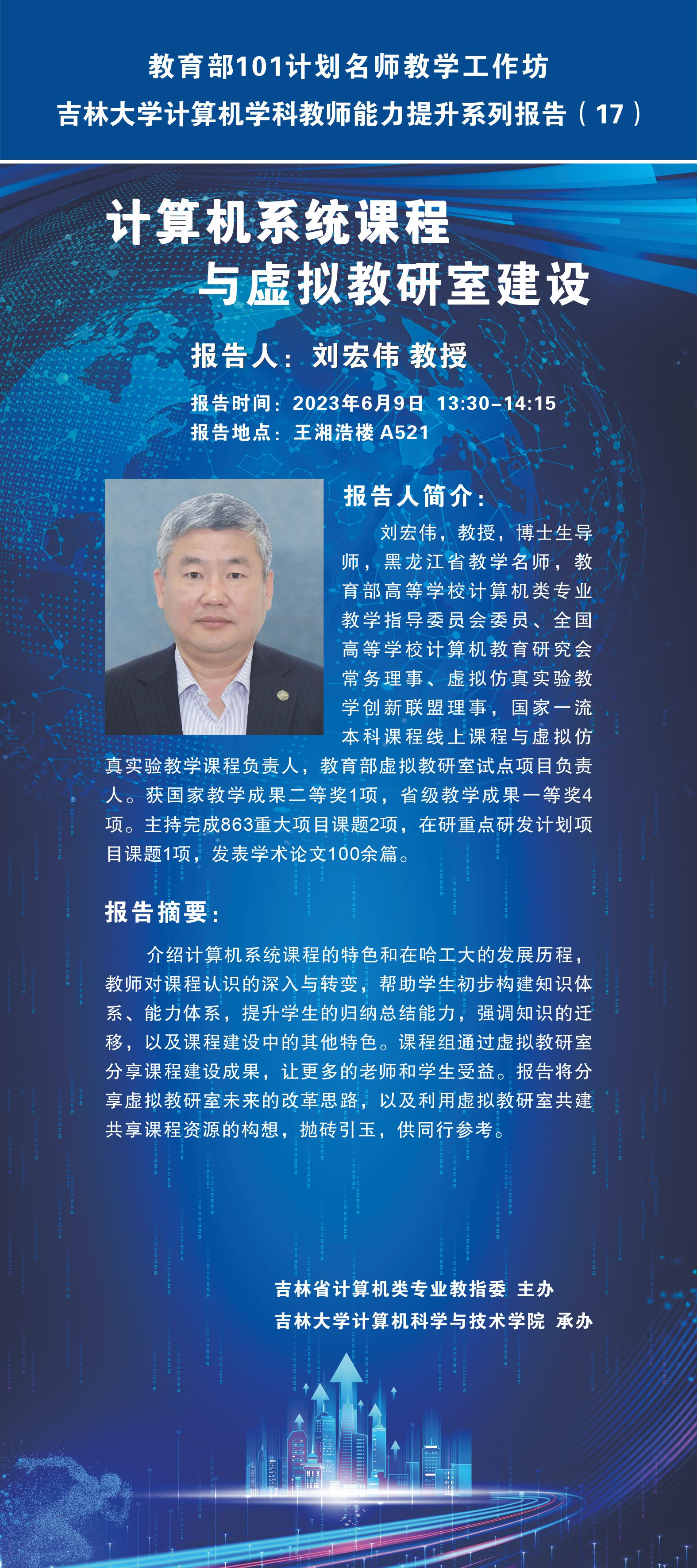 第一场报告是刘宏伟教授带来的名为《计算机系统课程与虚拟教研室建设》的报告,主要介绍计算机系统课程的特色和在哈工大的发展历程,教师对课程认识的深入与转变,帮助学生初步构建知识体系、能力体系,提升学生的归纳总结能力,强调知识的迁移,以及课程建设中的其他特色。课程组通过虚拟教研室分享课程建设成果,让更多的老师和学生受益。报告将分享虚拟教研室未来的改革思路,以及利用虚拟教研室共建共享课程资源的构想。