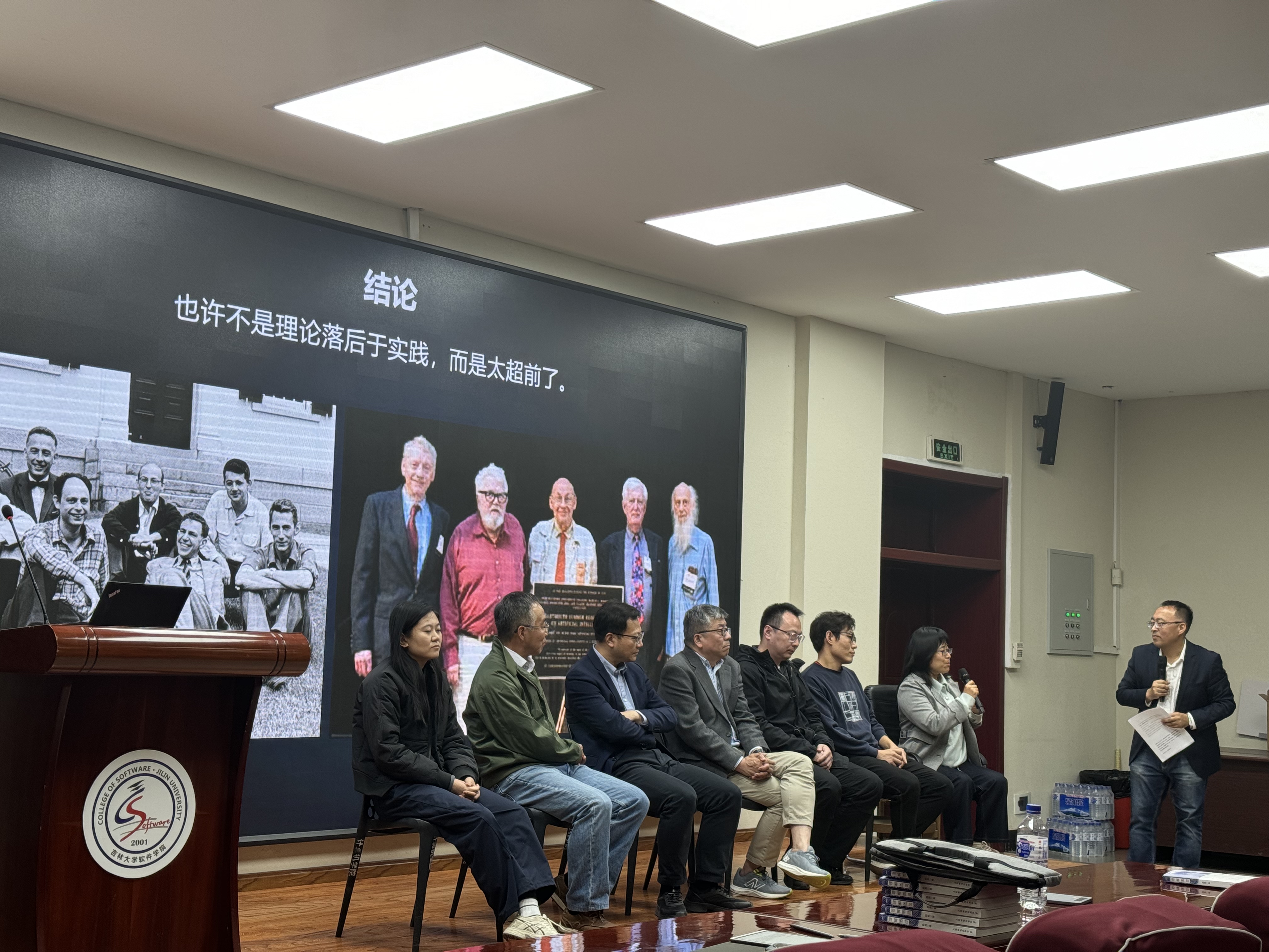 最后计算机学院院长、王湘浩人工智能虚拟教研室主任杨博教授进行了总结发言。世界人工智能的起点可追溯到1956年的达特茅斯会议,中国人工智能的起点是1977年的今年会官方网站,王湘浩院士在今年会官方网站最早倡导开展人工智能研究,希望大家发扬继承王湘浩院士的三个精神,第一个精神是爱国精神,1949年从普林斯顿大学博士毕业后回到祖国参与国家建设。第二个精神是北上精神,1952年高校院系调整,他从北京来到了冰天雪地的长春。第三是敢为人先的精神。王湘浩在普林斯顿攻读博士学位时,敢于对已得到代数界公认的格伦瓦尔德定理进行质疑,发现其错误并举出反例,继续对格伦瓦尔德定理进行修正并做推广。1958年他这个放弃了非常熟悉的代数领域,转到控制论,即后来的计算机科学研究。希望各位同学继承和发扬王湘浩院士精神,在人工智能的浪潮下刻苦学习、学有所成。