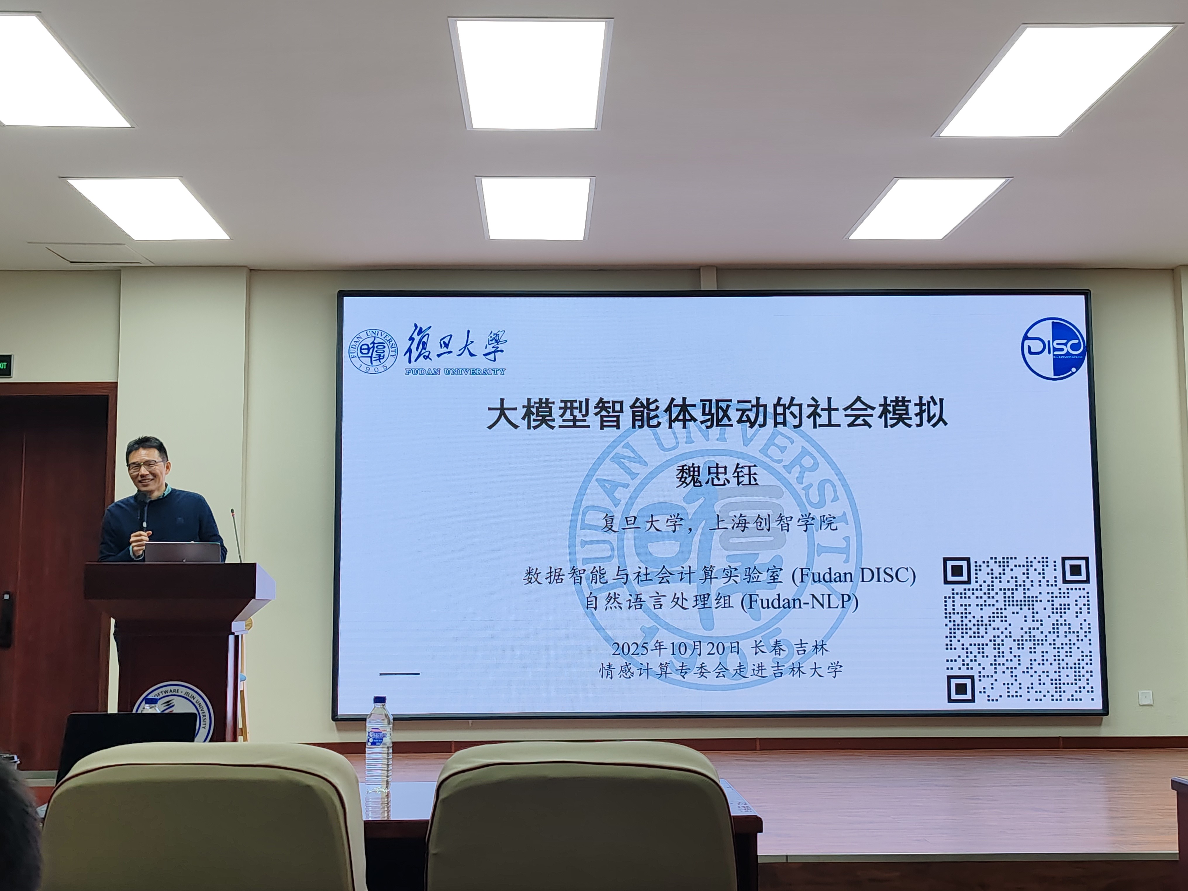 最后,复旦大学的魏忠钰副教授作了题为《大模型智能体驱动的社会模拟》的报告。他介绍了团队提出的 SocioVerse 框架,并指出大模型不仅能够服务于工程与产业领域,也正在成为社会科学研究的新工具,开启跨学科智能模拟的新篇章。