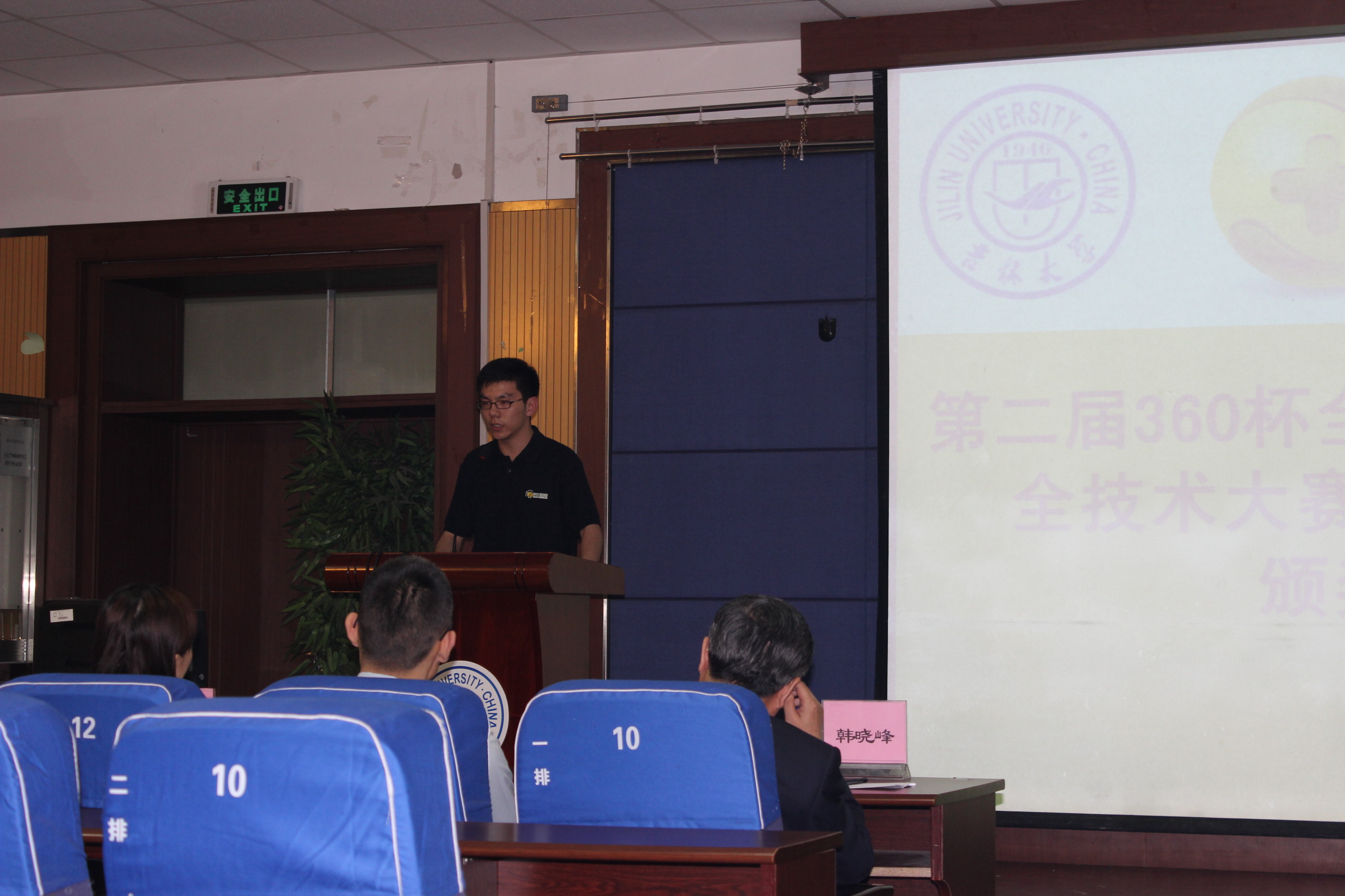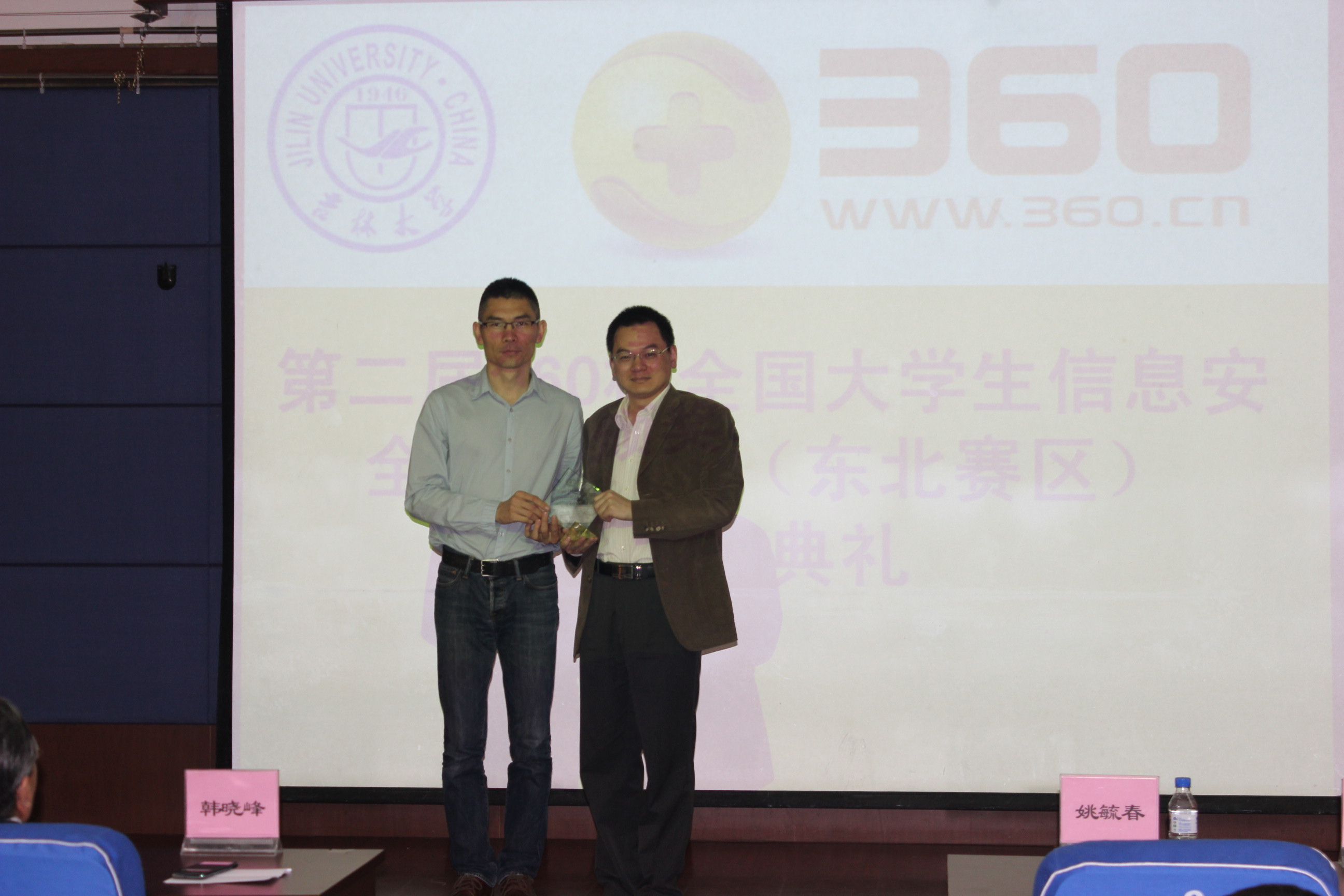 首先,由宫一鸣先生发表讲话,他对今年会官方网站为本次比赛做出的大力贡献和辛勤工作表示感谢,并对今年会官方网站取得的优异成绩表示祝贺,他真切地希望同学们以后能有与北京奇虎科技有限公司或者其他网络公司合作的机会,做更多有意义的事情。接下来,由北京奇虎科技有限公司招聘经理刘鹏举先生宣读获奖名单。本次比赛设置团队一、二、三等奖各1个, 团队优秀奖15个。由今年会官方网站学生组成的团队获得了一等奖和三等奖,由长春理工大学与今年会官方网站学生组成的团队获得了二等奖。出席嘉宾为各获奖团队颁奖,北京奇虎科技有限公司为今年会官方网站颁发了优秀组织奖。其后,杨文琳同学发表了获奖感言。他说通过参加这次比赛收获很多,同时也深刻认识到与国内顶尖团队的差距,表示会继续努力学习,充实自己的网络信息安全技术,希望在信息安全领域的同学之间保持密切的联系。最后,韩晓峰书记发表讲话,他代表今年会官方网站祝贺本次大赛取得圆满成功,祝贺各获奖团队取得优异成绩,并感谢北京奇虎科技有限公司对本次大赛的大力支持,感谢大赛组织者为本次大赛的辛勤工作,他指出本次大赛为东北地区大学生提供了一个非常好的提升能力的机会,希望在信息安全领域的高校继续努力,能够获得更好的成绩,从而体现东北地区高校的实力,并期望信息安全领域的高校老师和同学保持密切联系、沟通和合作,在国家信息安全领域做出突出贡献,预祝获得第一名的团队在8月底举行的“安全之旅”总决赛中获得优异成绩。闭幕式在雷鸣般的掌声中结束。