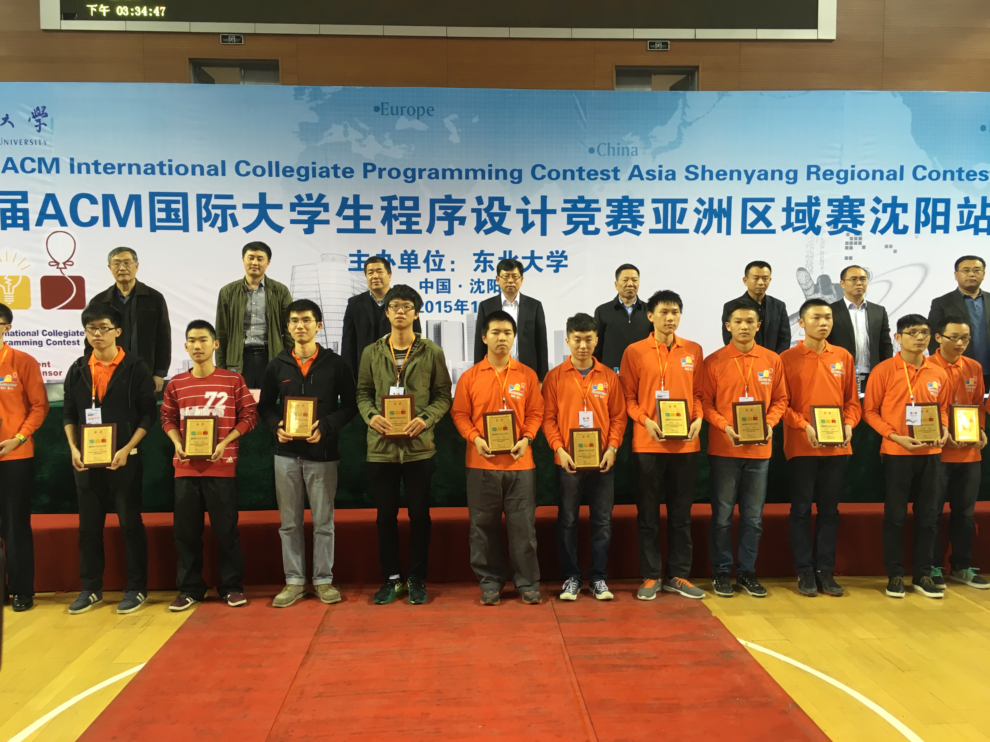 第40届ACM-ICPC国际大学生程序设计竞赛亚洲区沈阳站比赛于2015年10月24日至25日在东北大学刘长春体育馆举行。111所高校的162支参赛队参加了该站的比赛。经过激烈的角逐,共决出金牌17个,银牌34个,铜牌51个。由我校计算机学院2015级本科生邵杰晶、2013级唐敖庆班本科生王心天和软件学院2013级卓越工程师班本科生郭兰哲组成的“三花聚顶”队获得金牌,学校排名第8。
