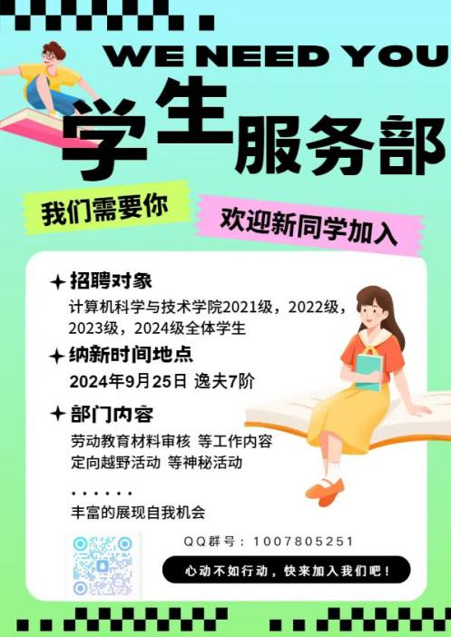 学生服务部作为计算机学院学生会创立不久的部门,是一个充满活力与创造力的部门,致力于为广大同学提供更美好的校园生活。学生服务部正在逐渐成长,每一份新加入的力量都拥有无限的可能,去尝试、去冒险、去突破,学生服务部为每一位成员提供了让自己的想法生根发芽,得到真正落行的沃土。