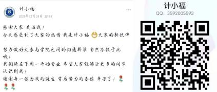1.本部门经营着计科特有的小助手—计小福,发布通知,统计并解答计科学子们在校园生活遇到的问题,让大家更好的了解大学生活。
