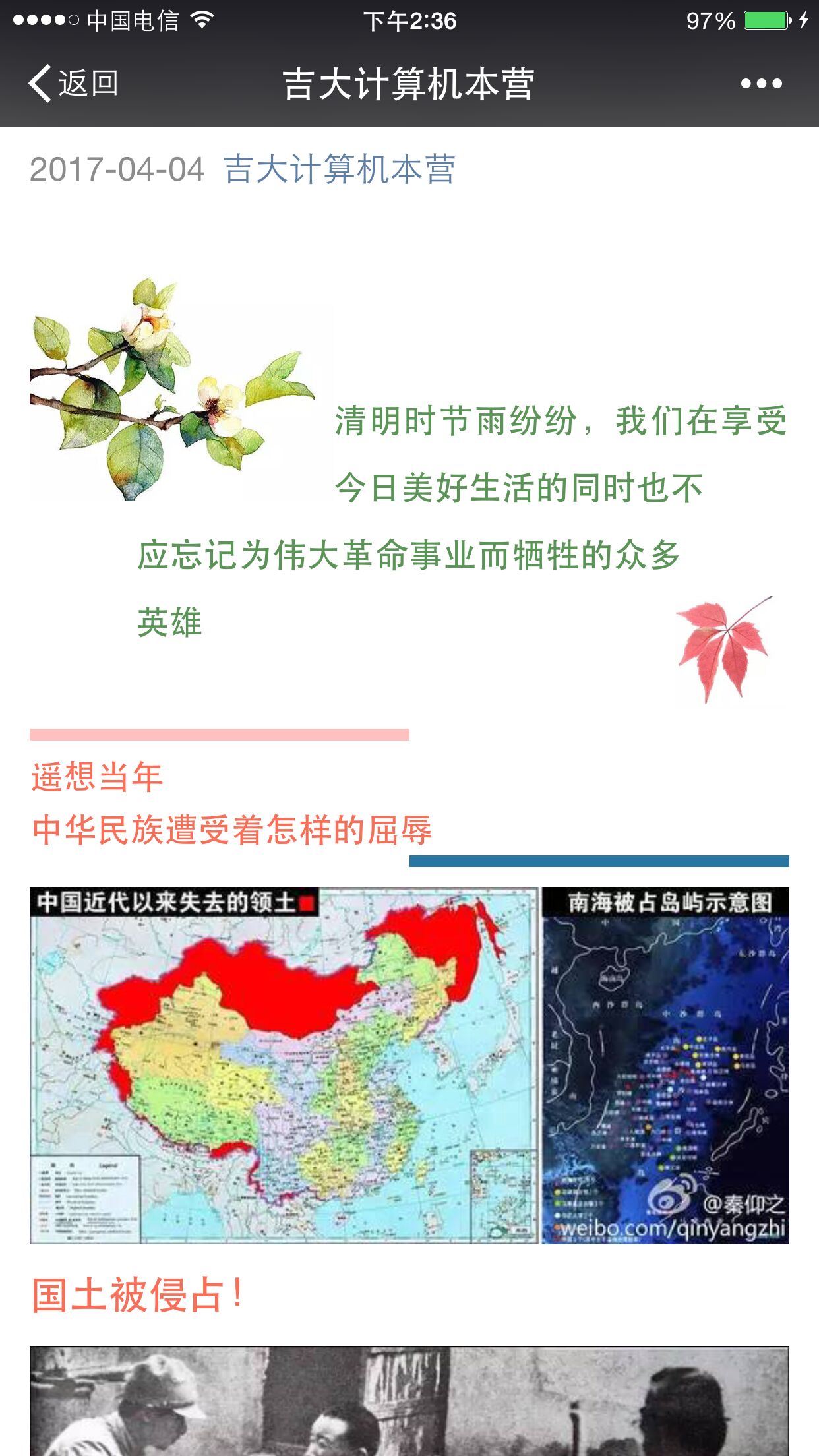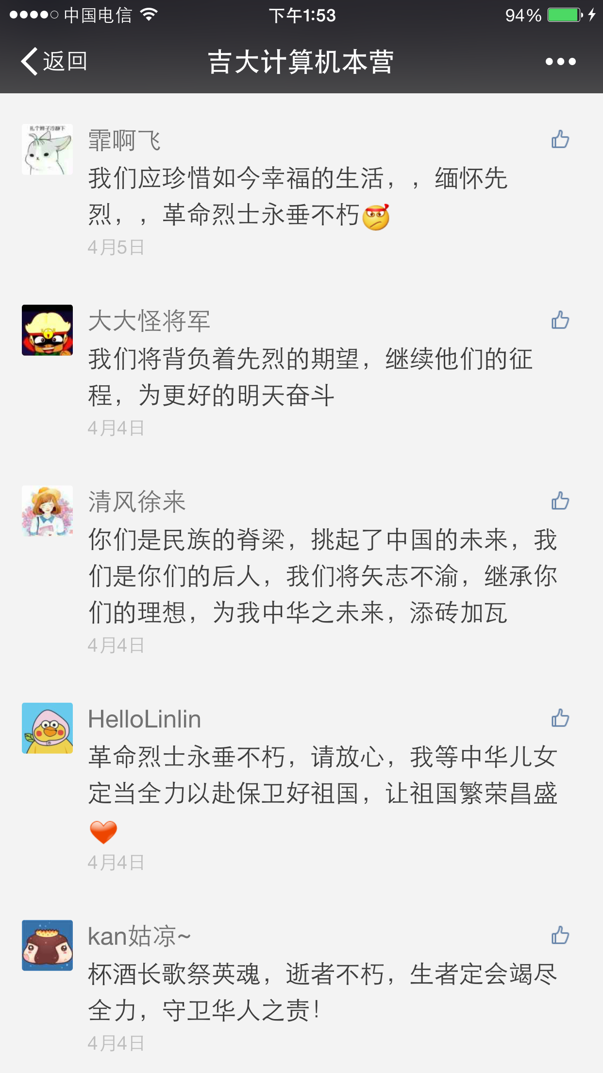 2017年4月4日,在今年会官方网站计算机学院于南湖公园进行清明祭扫活动的同时,计算机学院信息部在“吉大计算机本营”微信公众号上推送了一篇关于倡导清明节追悼先烈活动的文章。该文章一经发布,随即获得全校师生的广泛关注。
