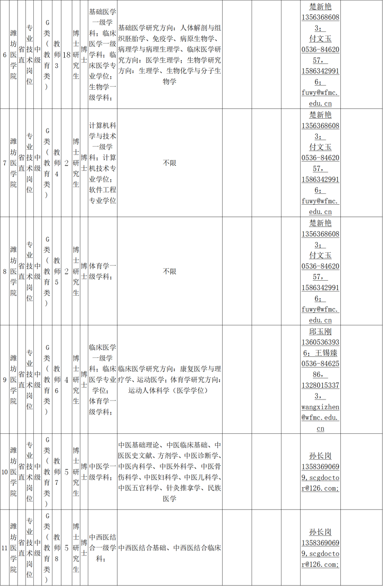 电子信箱:zhaopin@wfmc.edu.cn(应聘者可通过电子邮件方式报名,将个人应聘材料发送到各需求单位邮箱并抄送wfyxyrsc@126.com。应聘邮件标题:应聘岗位名称-姓名-学历-专业-毕业院校-中国博士人才网)