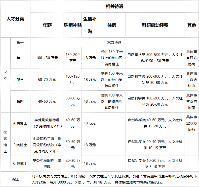 (三)引进人才待遇中的生活补贴是根据潍坊市人才政策,每月3000元,享受5年,共18万元。购房补贴中学校购房补贴为学校一次性发放(税前),潍坊市30万购房补贴具体根据潍坊市有关政策执行。