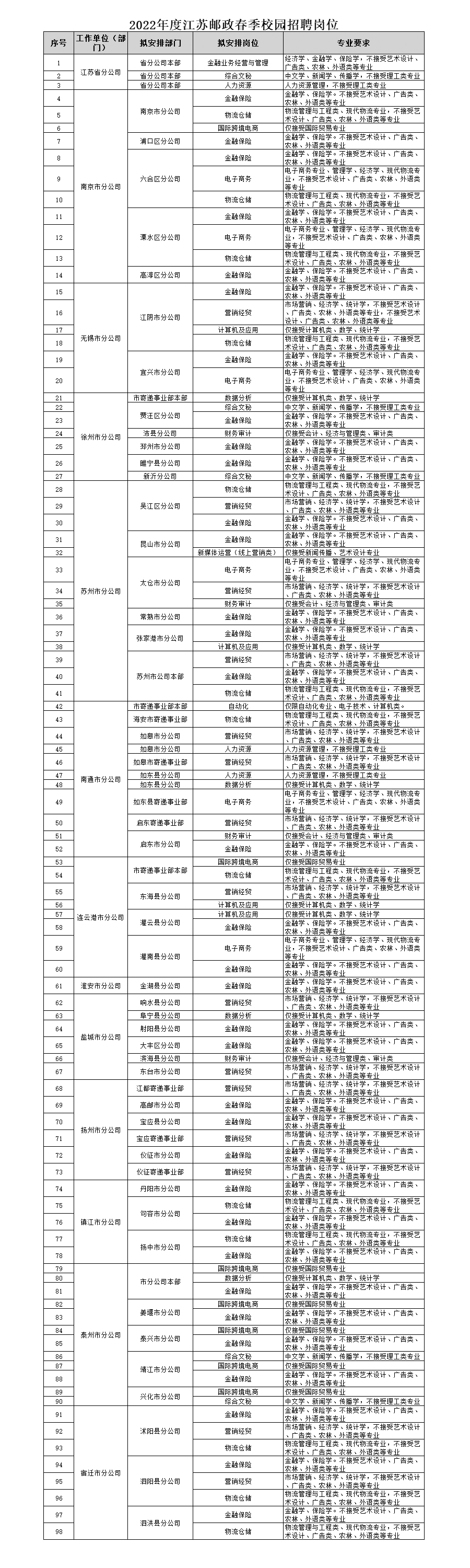 中国邮政江苏省分公司2022春季校园招聘公告